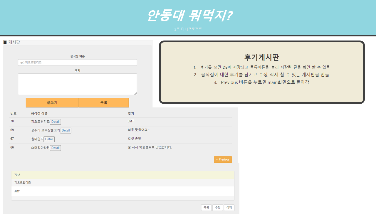 프로젝트/미니프로젝트 [3_미니프로젝트]안동대 뭐먹지?웹페이지 by 호아니 2020. 9. 11. 최종 웹페이지 공유하기 게시글 관리 코드기록 '프로젝트 > 미니프로젝트' 카테고리의 다른 글 [2_미니프로젝트]엘레베이터(아두이노, 라즈베리파이 프로젝트) (1) 2020.07.17 [1_미니 프로젝트] 공정관리 시스템 만들기 (0) 2020.06.25 관련글 [2_미니프로젝트]엘레베이터(아두이노, 라즈베리파이 프로젝트) [1_미니 프로젝트] 공정관리 시스템 만들기